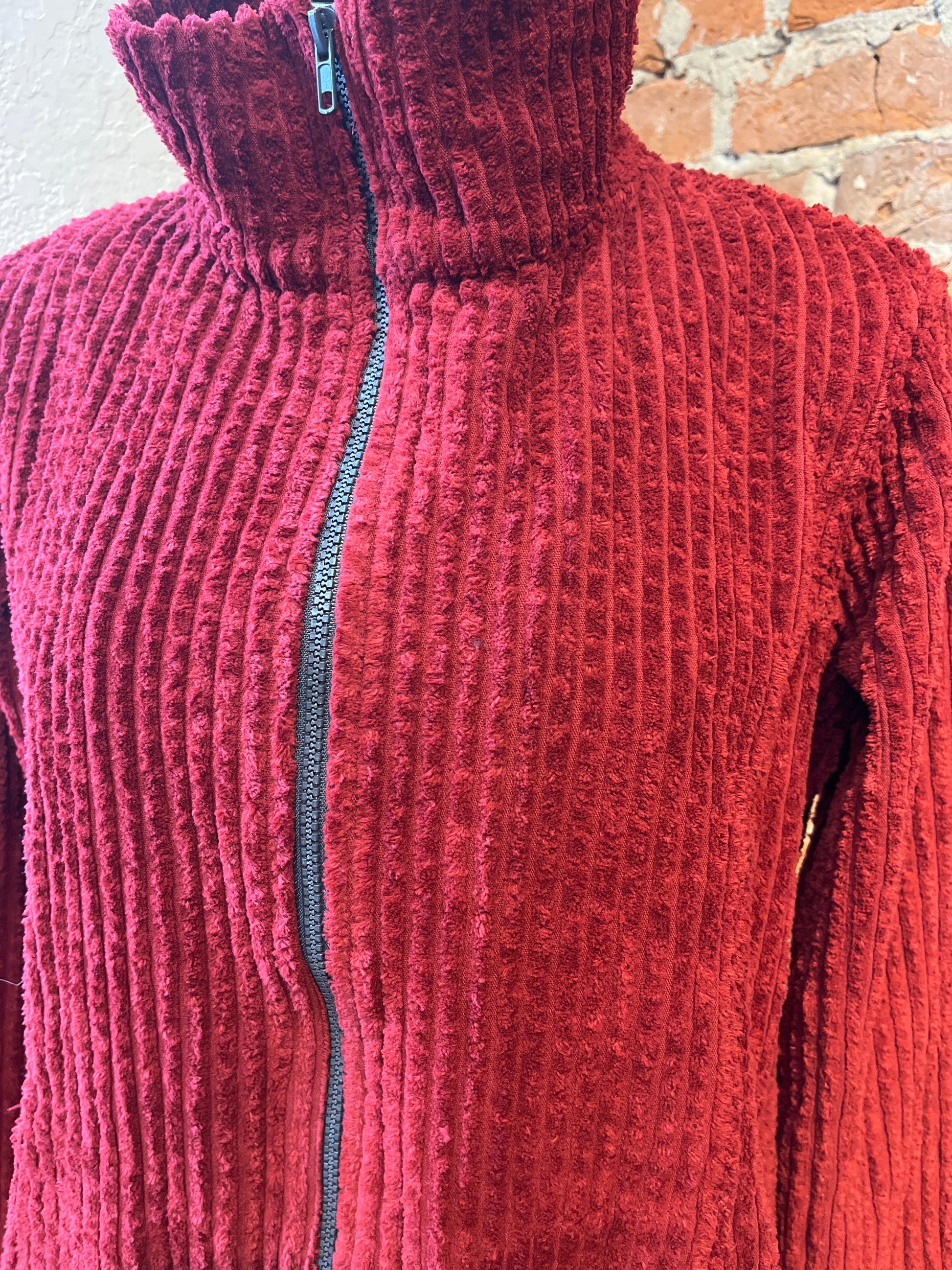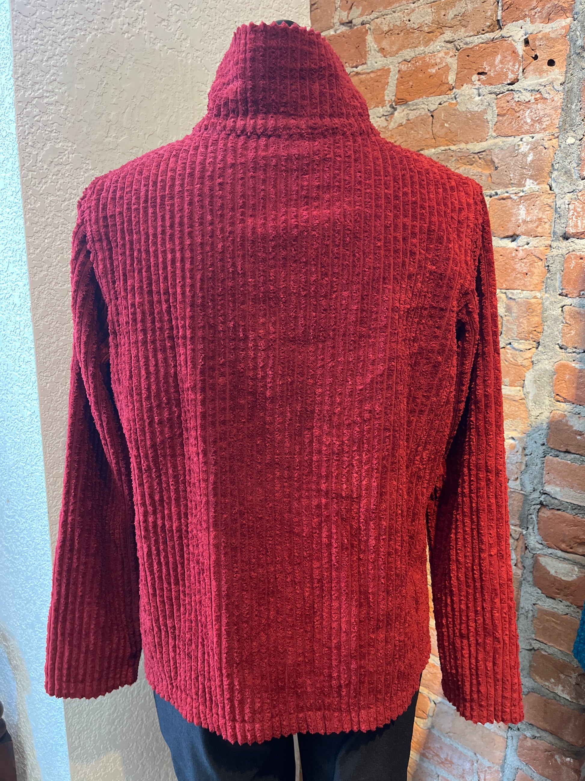Product features: zip front, stand up collar--or or unzip and fold down for pointed collar, pockets at side seam, below hip length on most