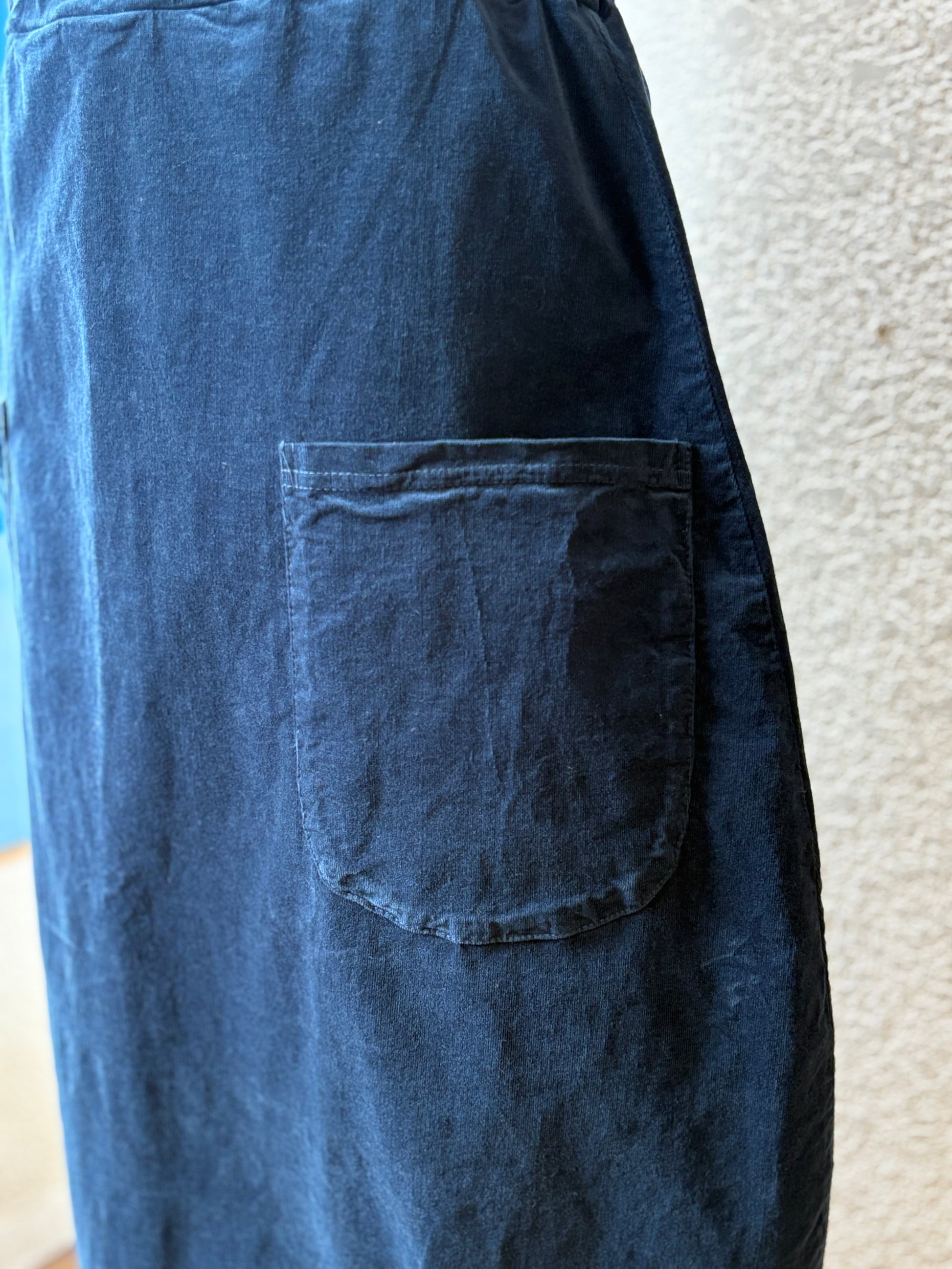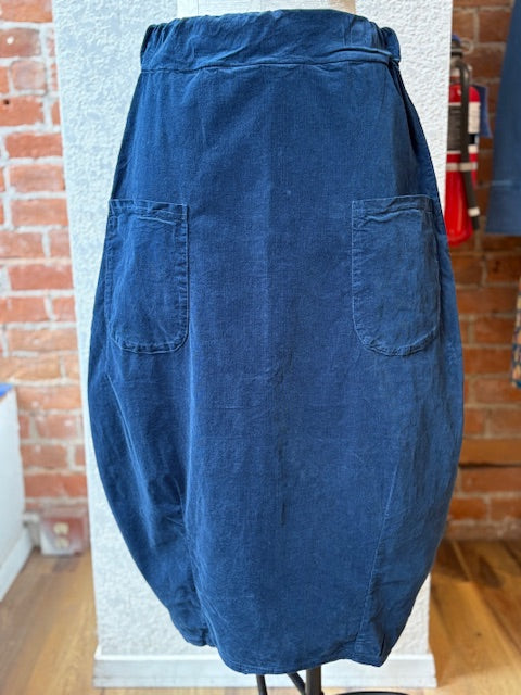 Features: soft crushed mini cord fabric, wide elastic waistband, lantern/balloon shape with darts at bottom hem, patch pockets, midi calf length on most