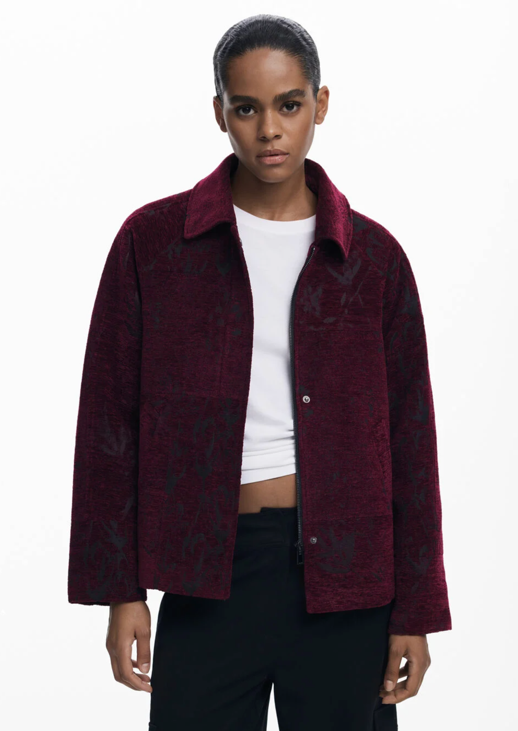 Product Features: Textured short coat with zipper and button closure, front pockets, and shirt collar