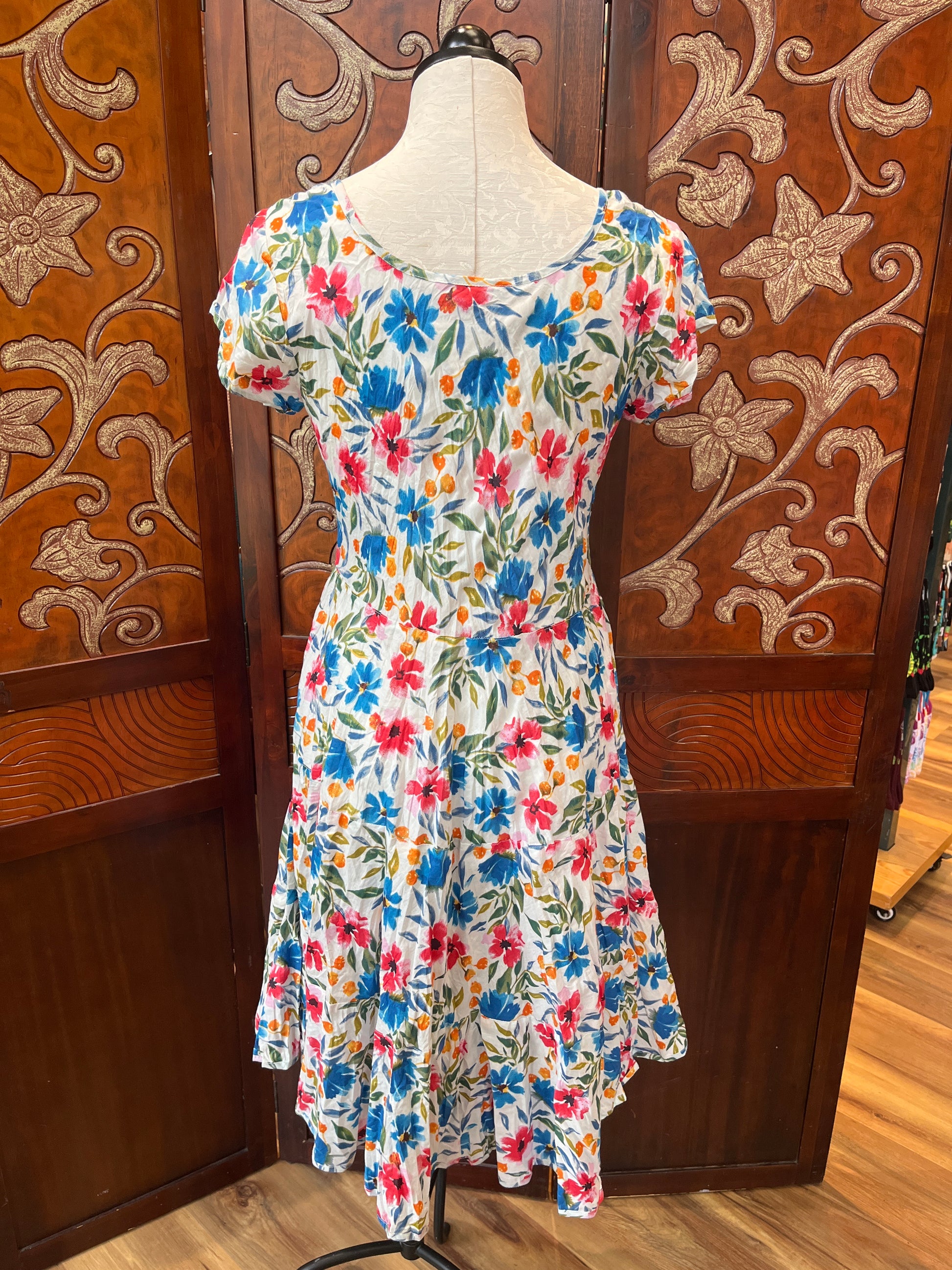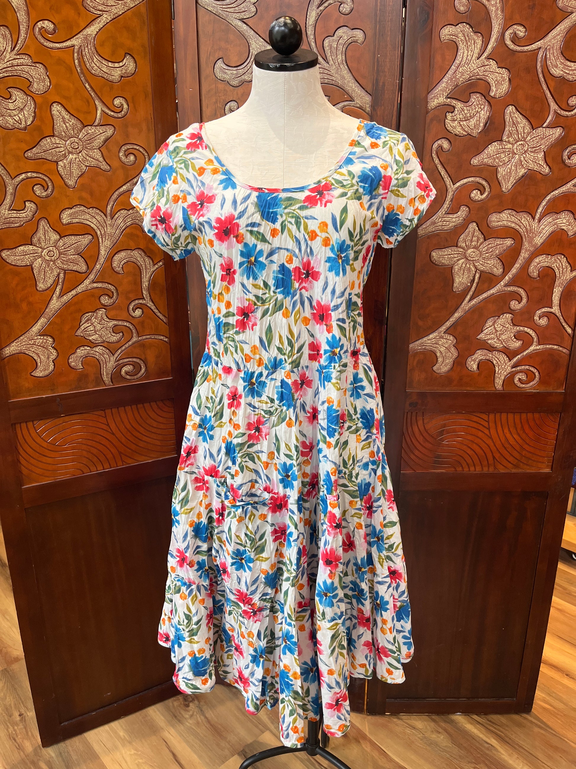 Product details: scoop neck, short sleeves, raised waist, front pockets on tired seam, bias-cut bodice, full skirt, at or below knee length on most
