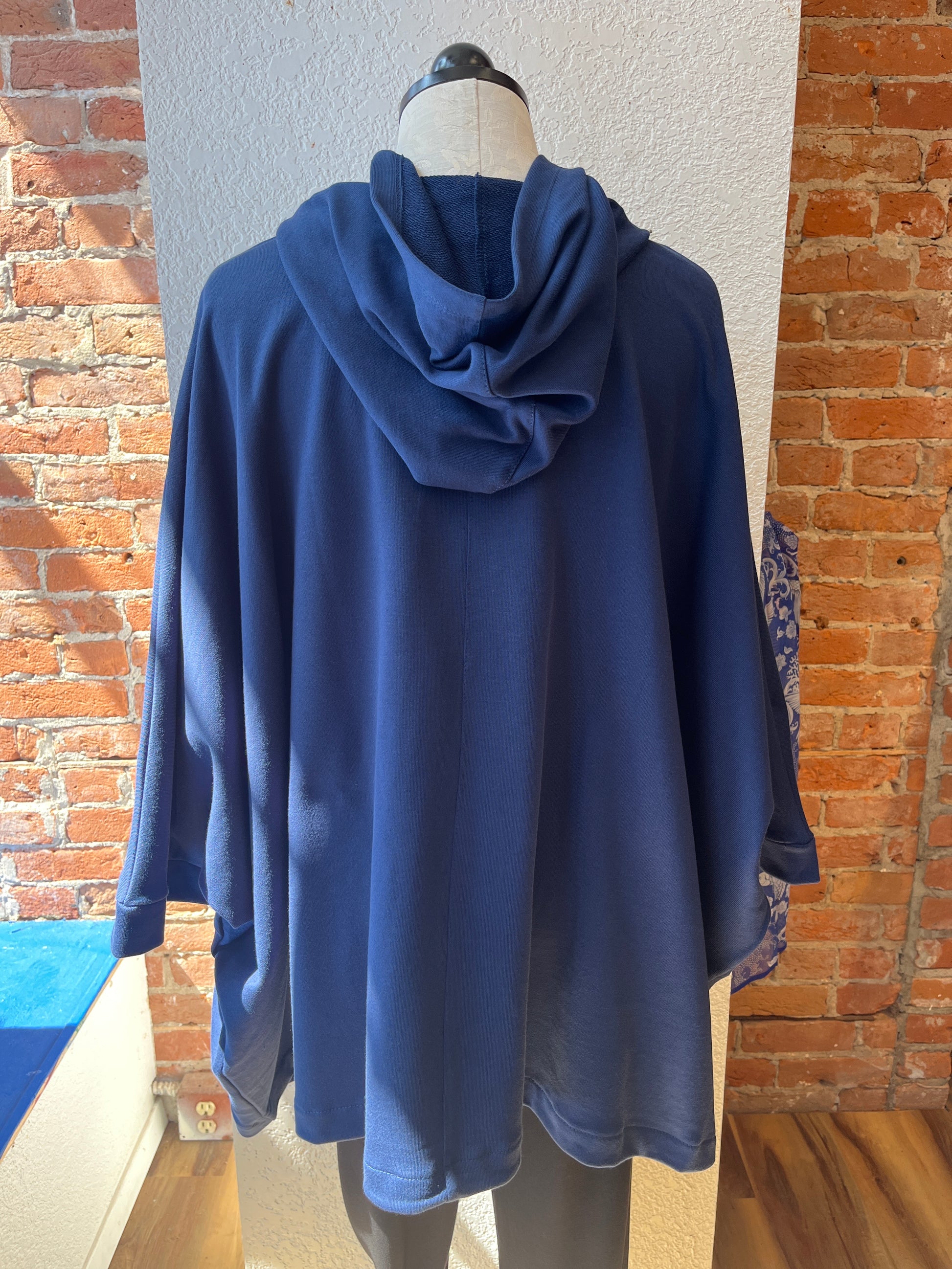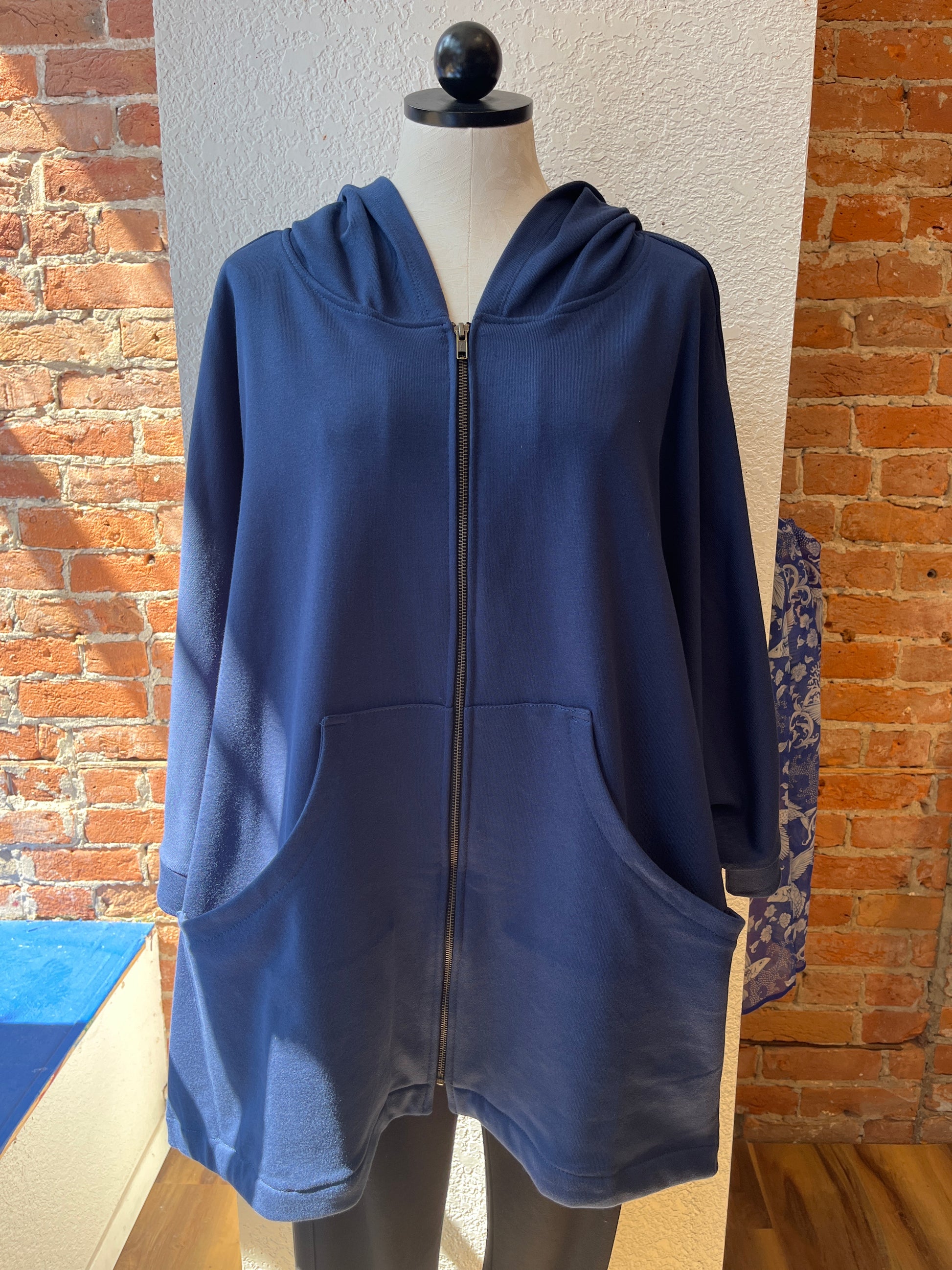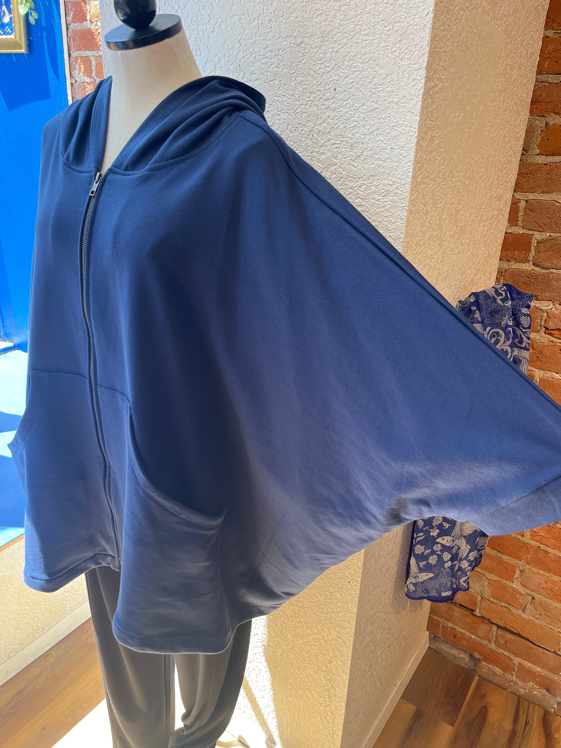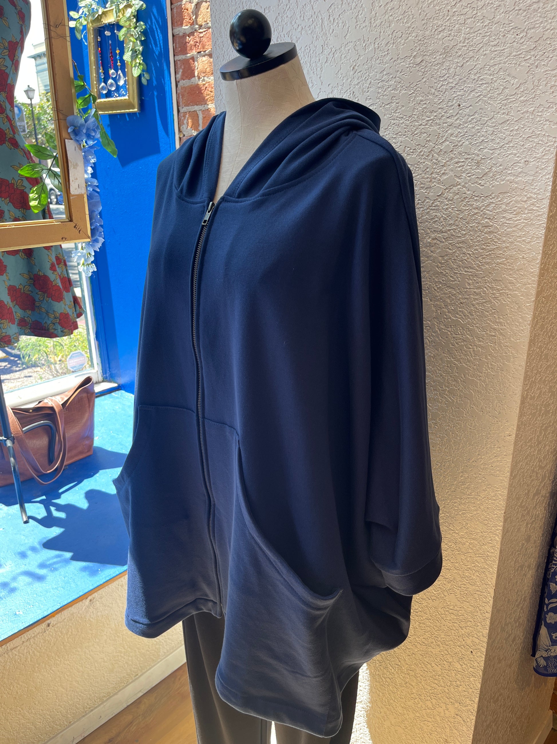 Product description: zip front, hooded, 3/4 length batwing/dolman sleeves, large/deep pockets have smaller pocket inside to hold phone or other smaller items in place