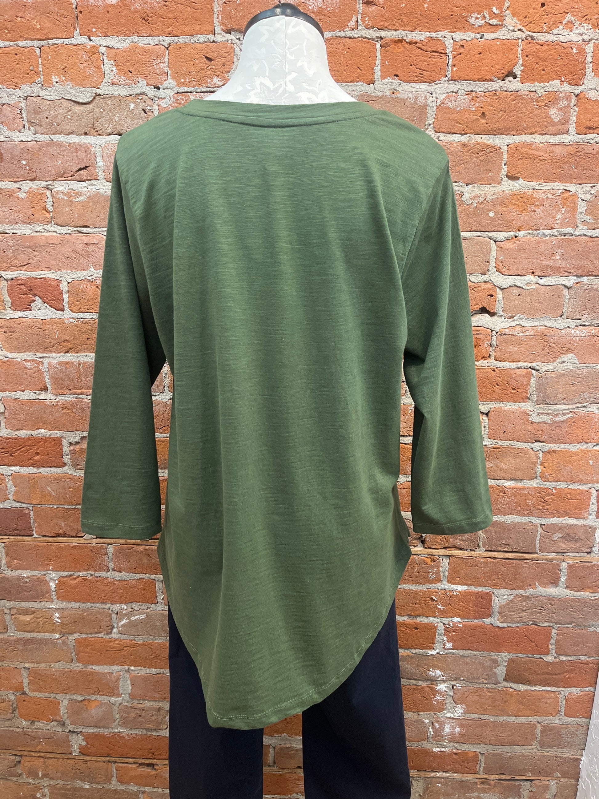 Features include a scoop neck, ¾ length sleeve, curved hi-lo hem line (back is longer than the front). Slub fabric is thicker with slightly raised threads giving the fabric a textured look and feel. Tear away label.