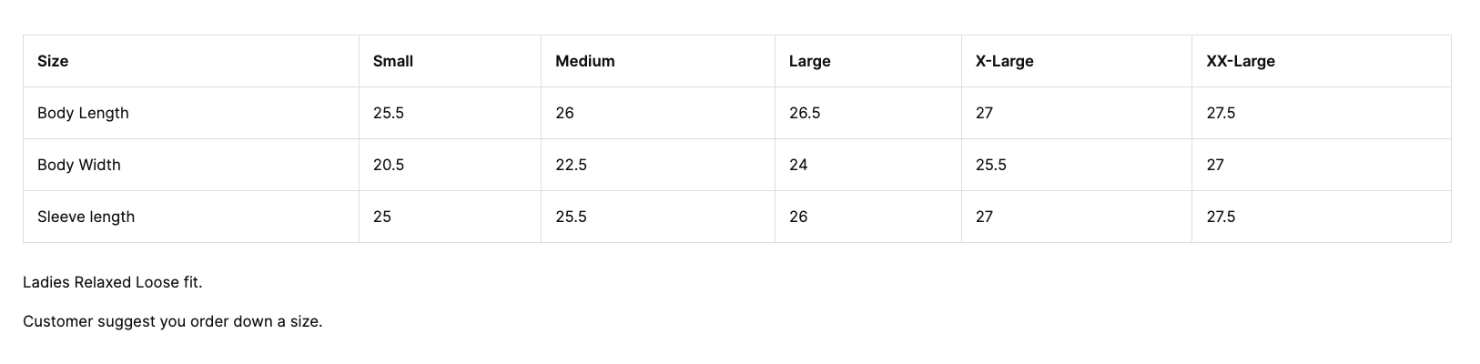 Sizing: Ladies Relaxed Loose fit. See image for details