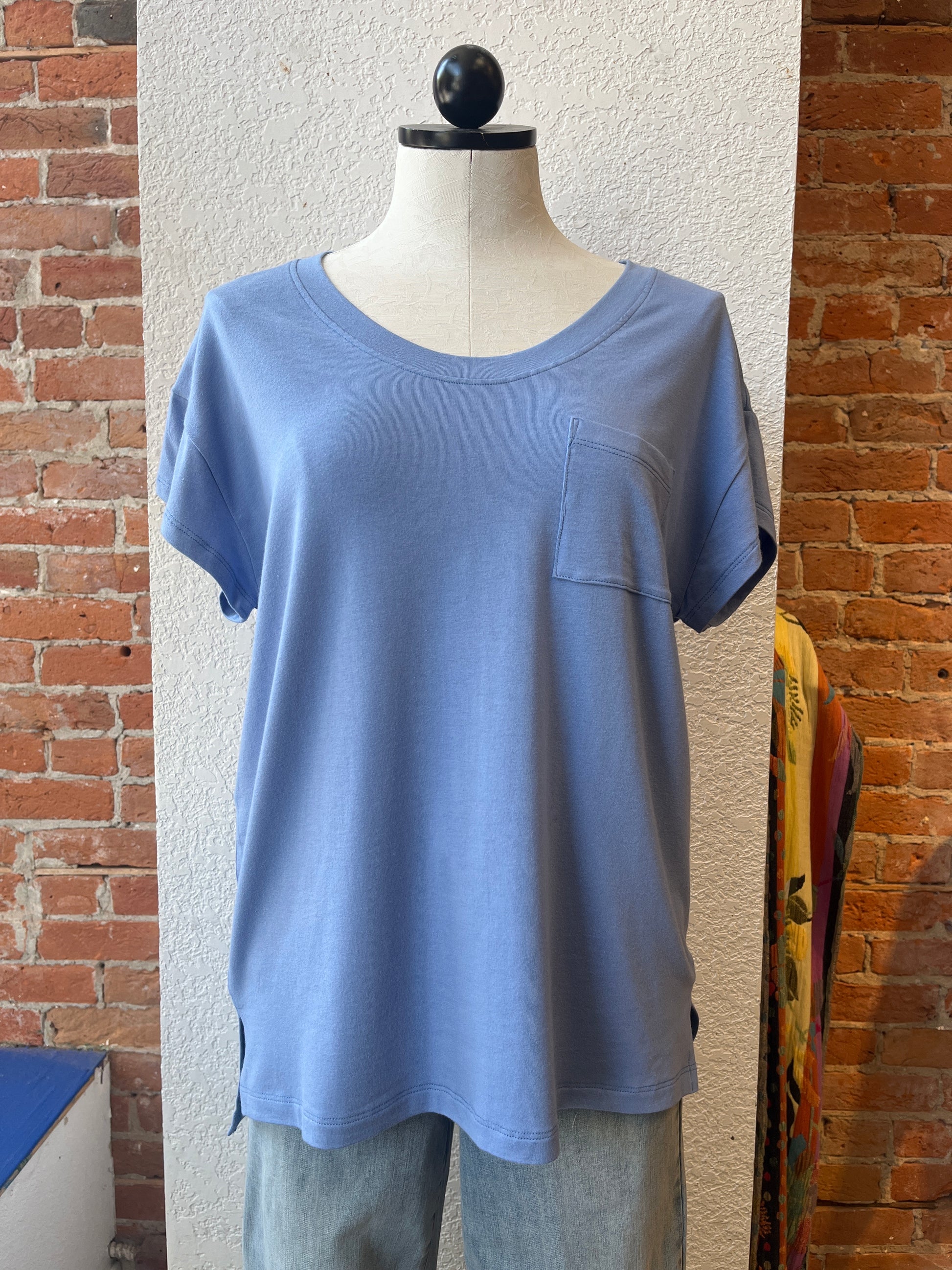 Product Features: loose fit, u-neckline, short sleeve, single pocket on left breast, below hop length on most