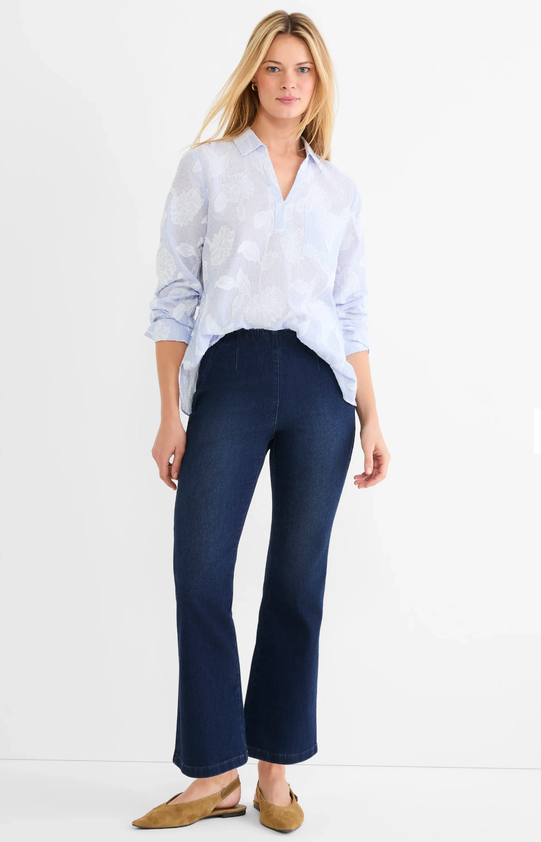 Menswear stripe, meet romantic florals. With a relaxed fit, the Sky Stripe Jacquard Top is like your essential popover top, but elevated with embroidery details, back pleating, and an easygoing placket. Made from breathable cotton that feels (and fits) like a dream.