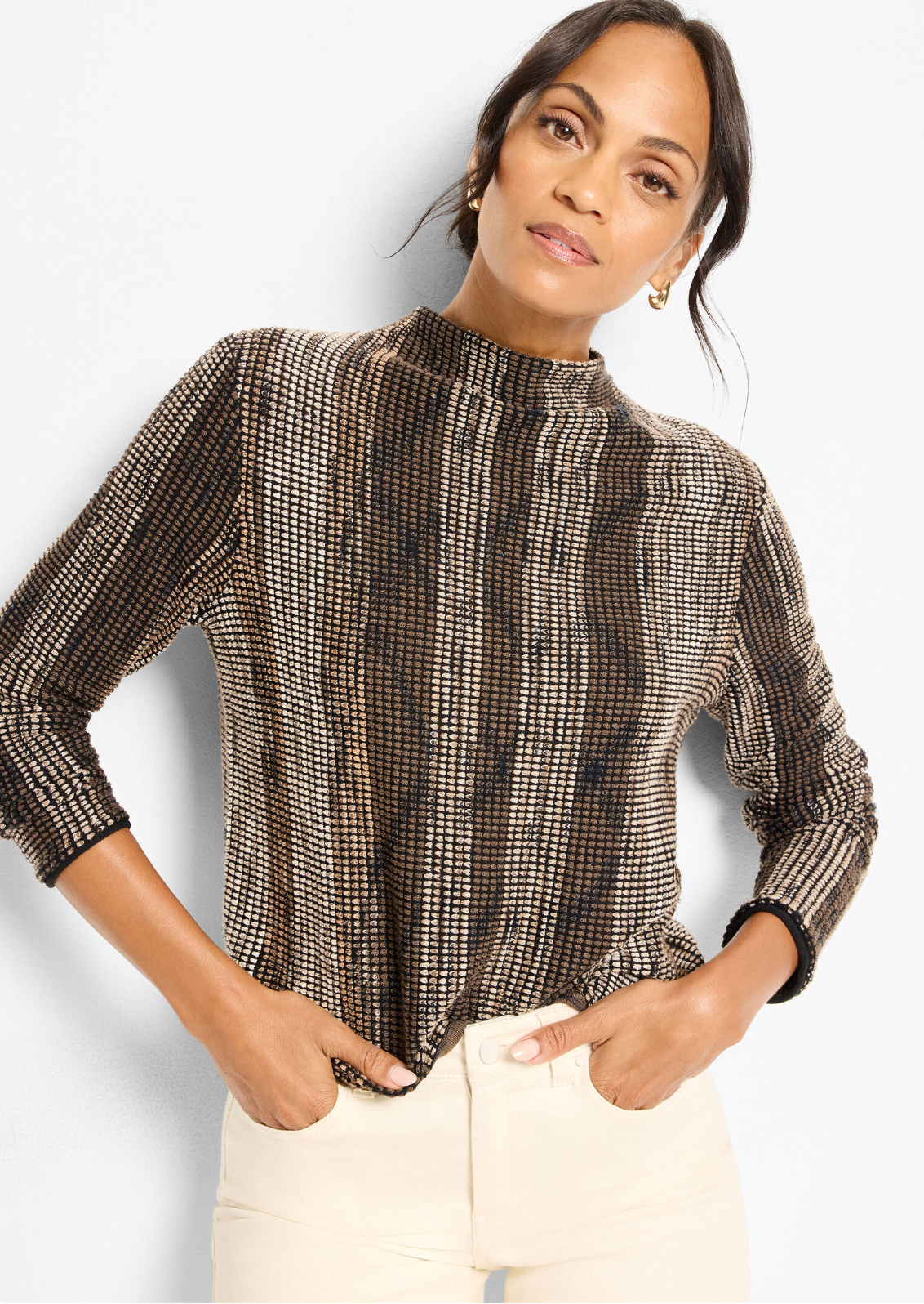 Sweater: Elegant, sophisticated, and unlike anything else in your closet. Our knit experts went all-in here: combining poppy pixel knit technique and five different kinds of space dye yarn to create the stunningly unique mélange of color and pattern. The funnel neck finish adds one last touch. Wear it with the matching skirt for a chic sweater set. Mindfully Made from fully fashioned knitwear that eliminates textile waste.