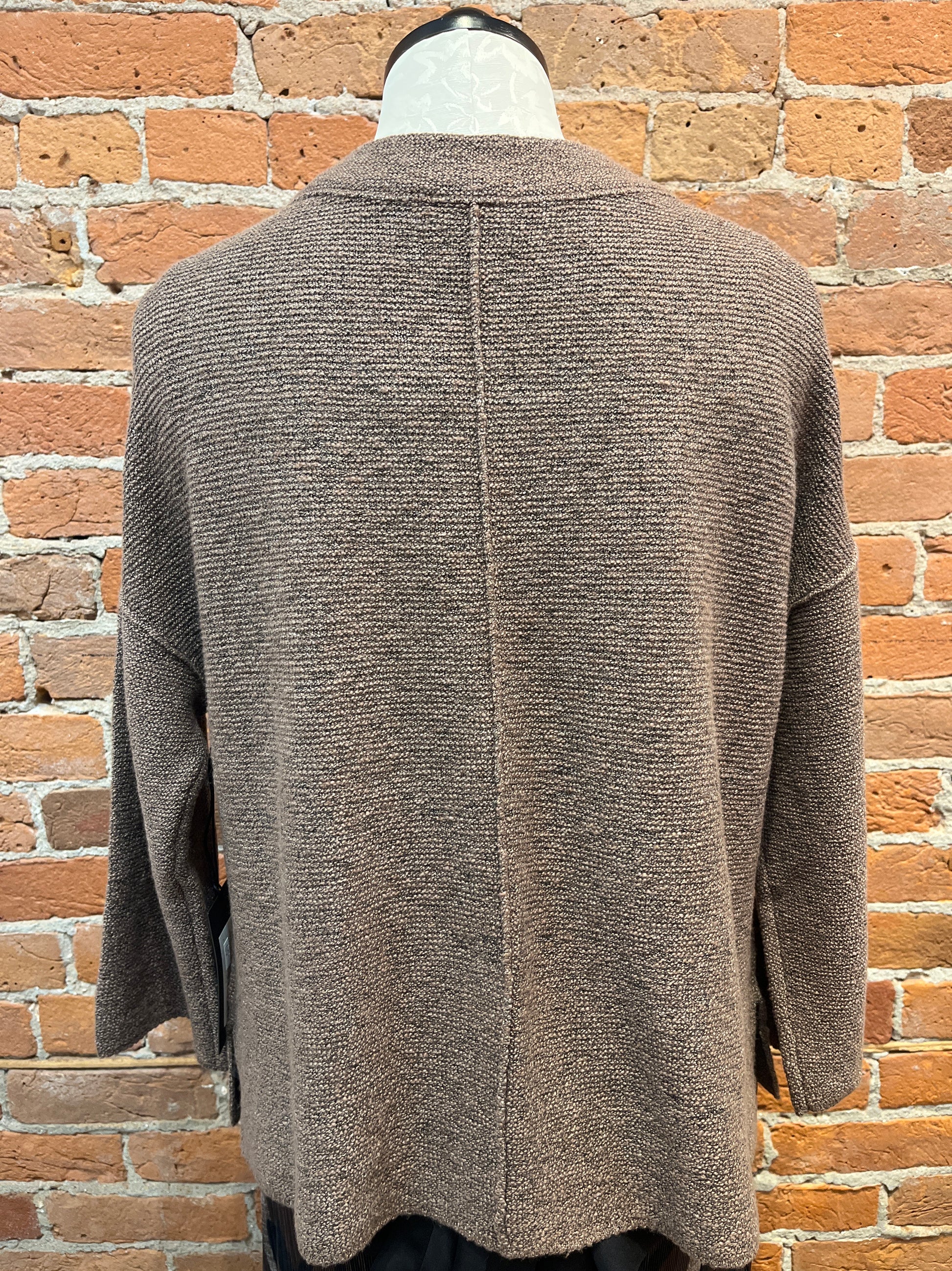 Product details: high crew neck, shaker knit, wide band neckline, 3/4 sleeves, vertical central seam on front/back, waist length on most