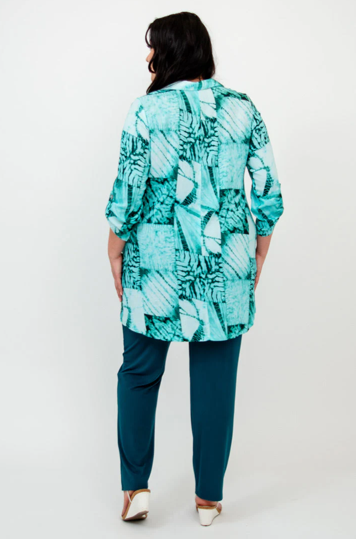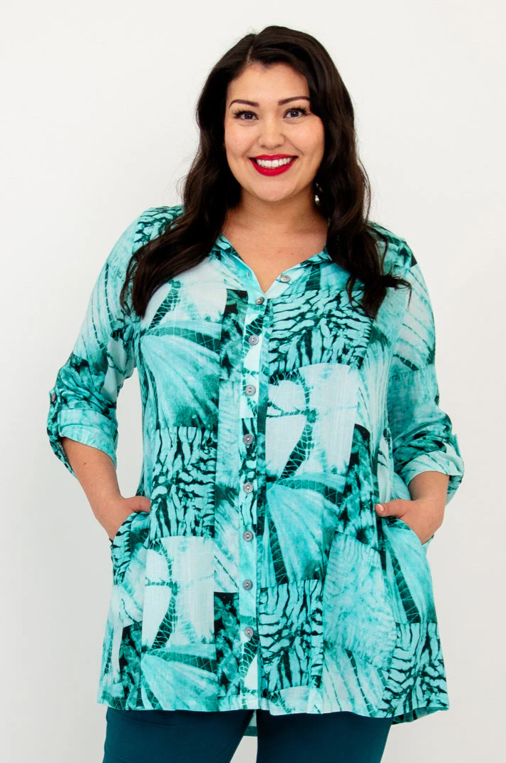 La forma suave del Bambú/Lino en una túnica extragrande con bolsillos. Estilo camisero en el hombro, con cuello y tapeta de botones en la parte delantera. El Celine tiene una forma de línea A, fluida y completa. Combínalo con pantalones capri o leggings.