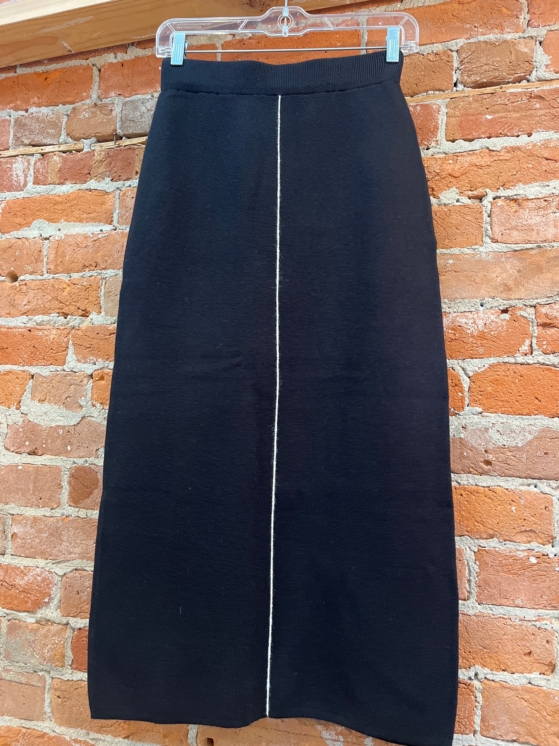 Product details: pull on smooth waist band, contrast seam down front center, narrow pencil fit, mid-calf length on most