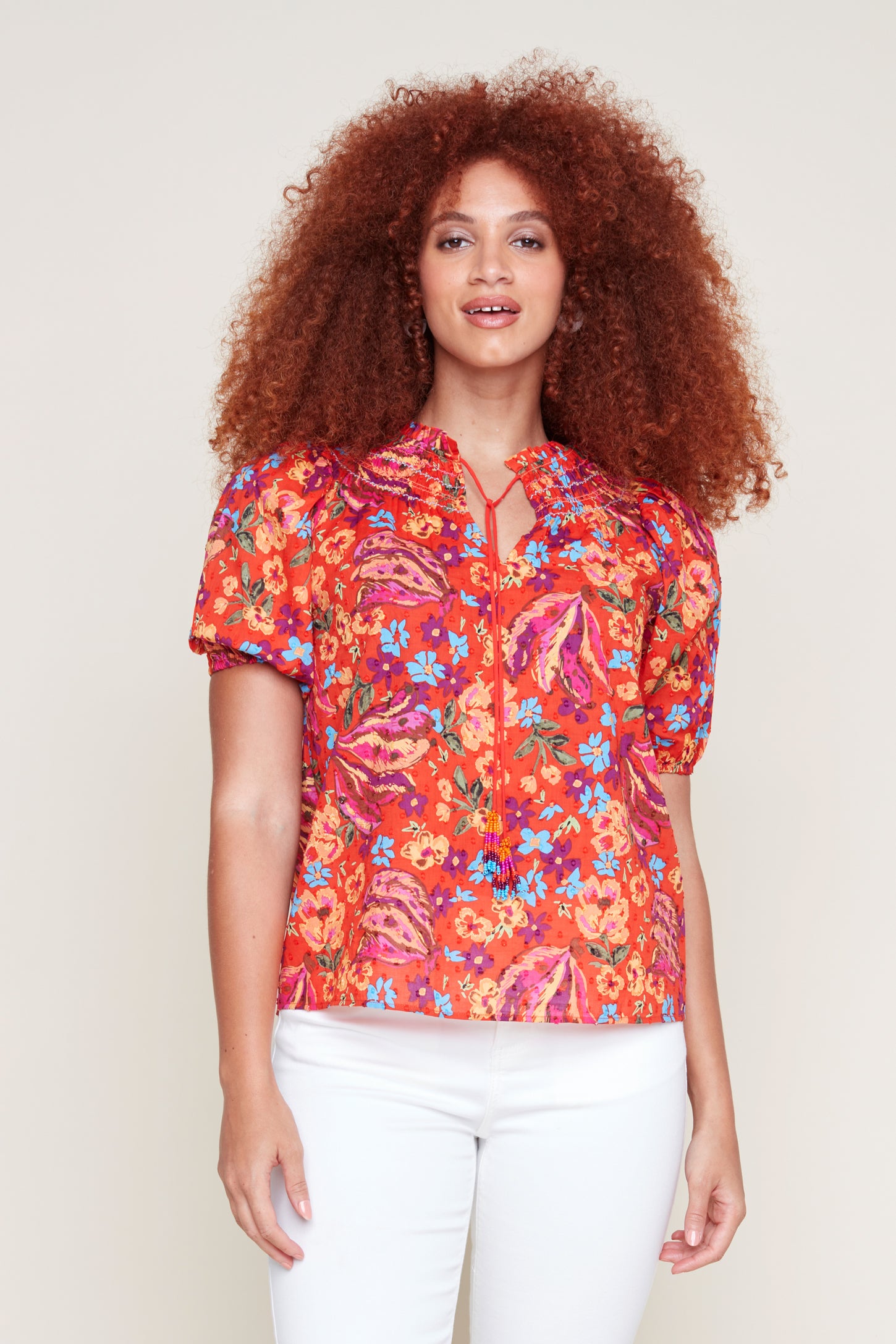 Características del producto: cuello dividido con fruncido y corbata, manga corta con elástico, largo entre la cintura y la cadera en la mayoría