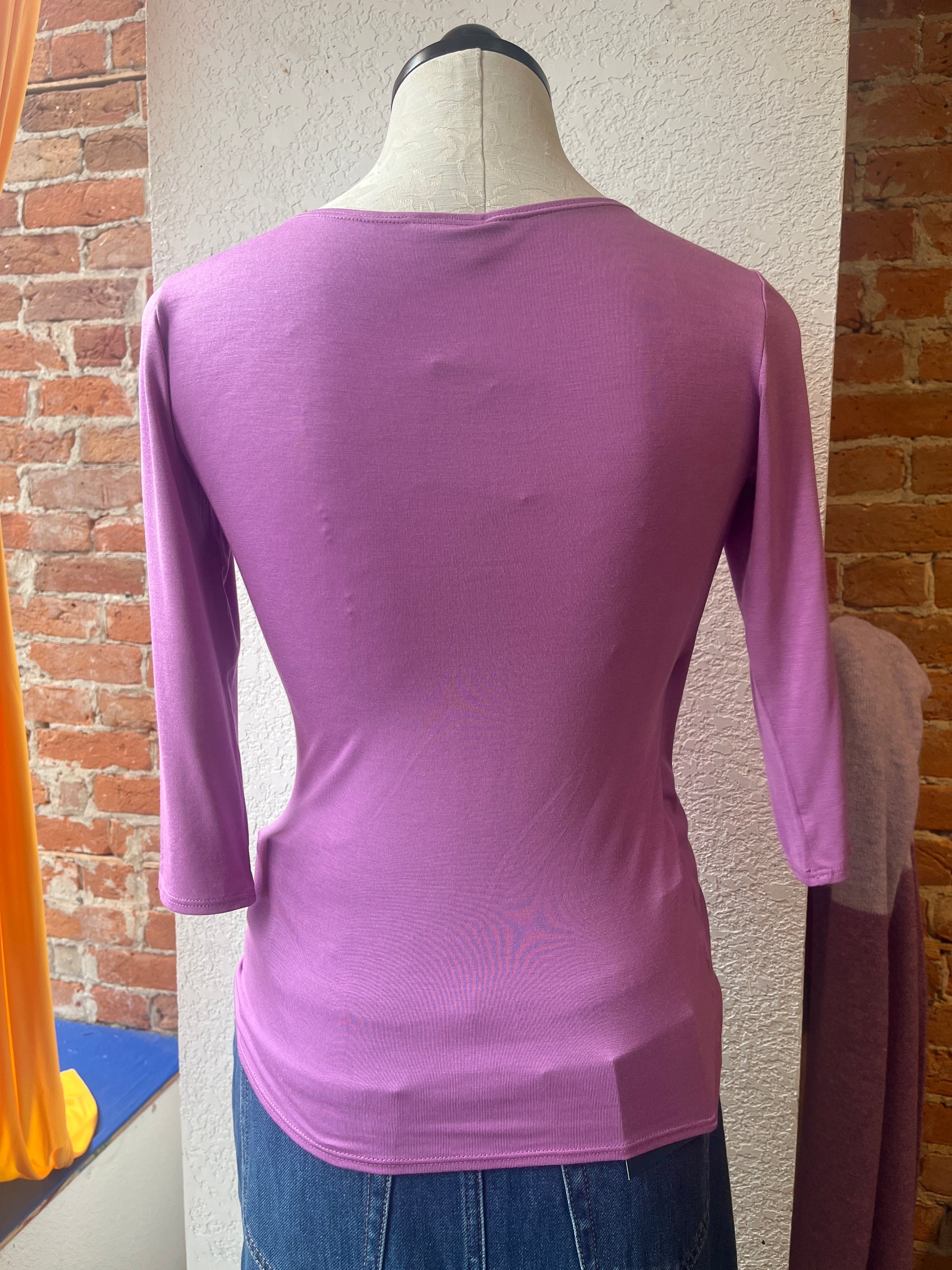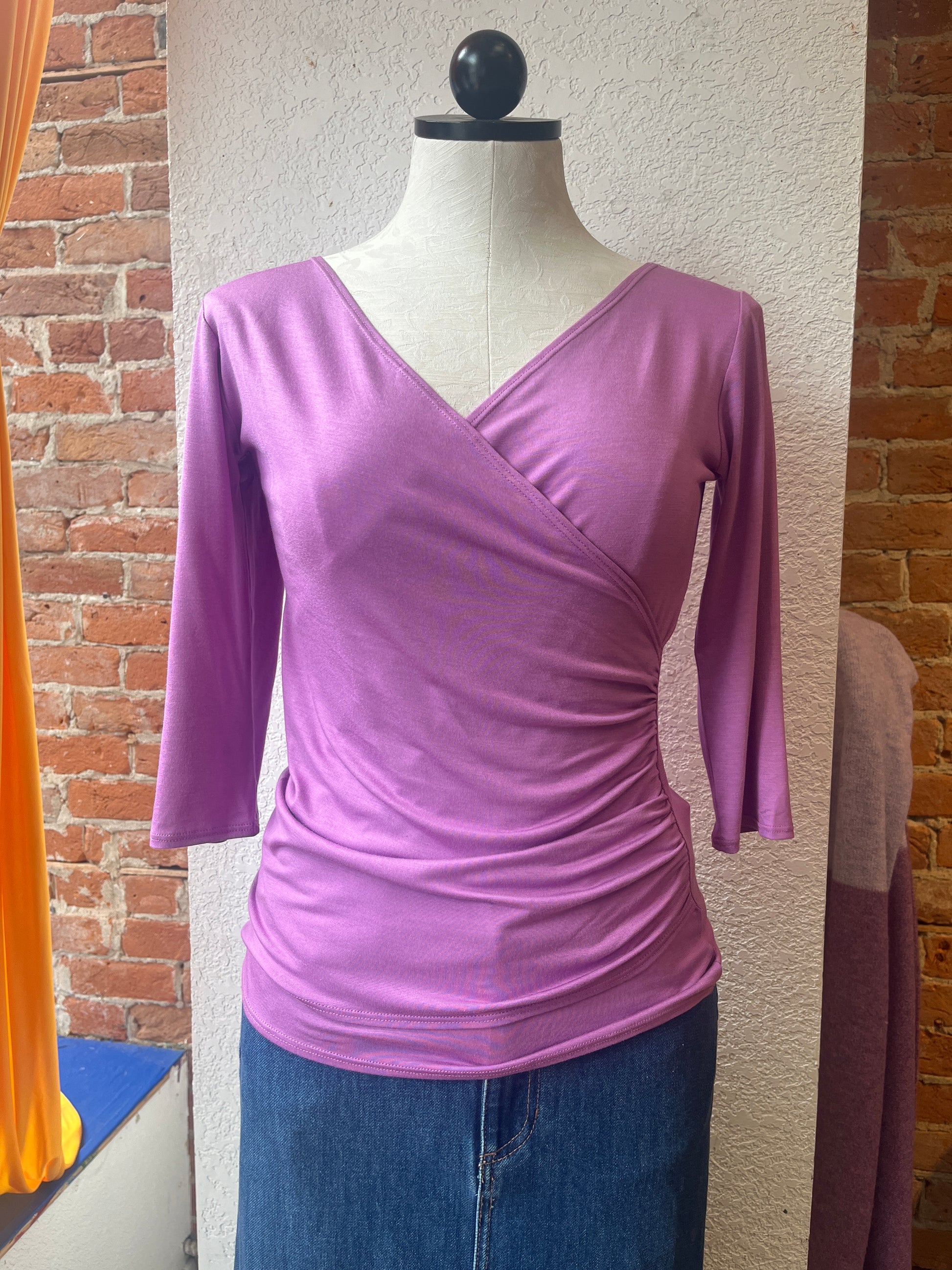 La camisa cruzada tiene un corte sofisticado, con frente cruzado, cuello en V y fruncidos favorecedores. La camisa abraza el cuerpo y el dobladillo cae unos centímetros por debajo de la cintura.
