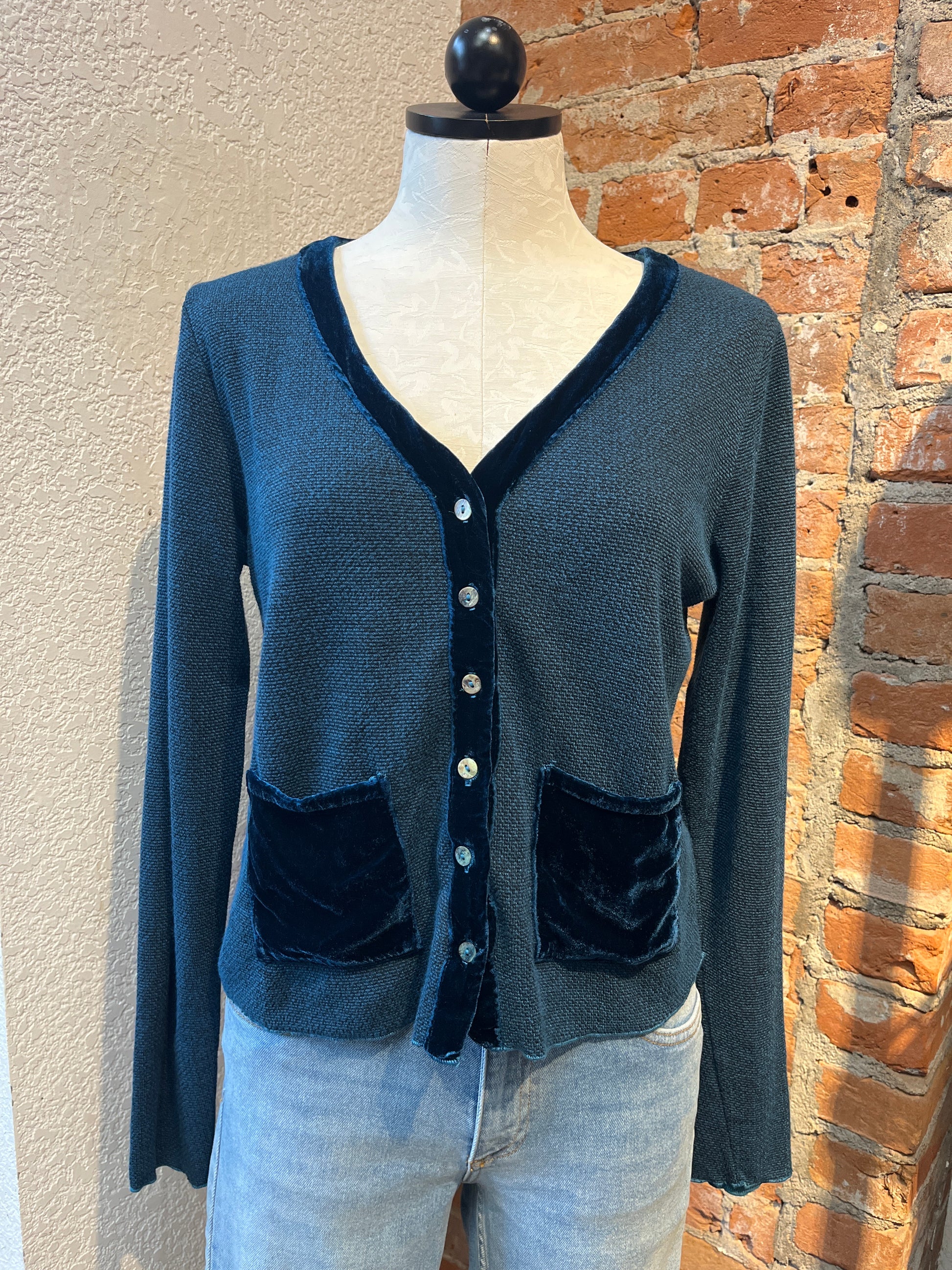 Product features: marled knit fabric, v-neck, long sleeve, button front, velvet trim on button panel/neckline, velvet patch pockets on front