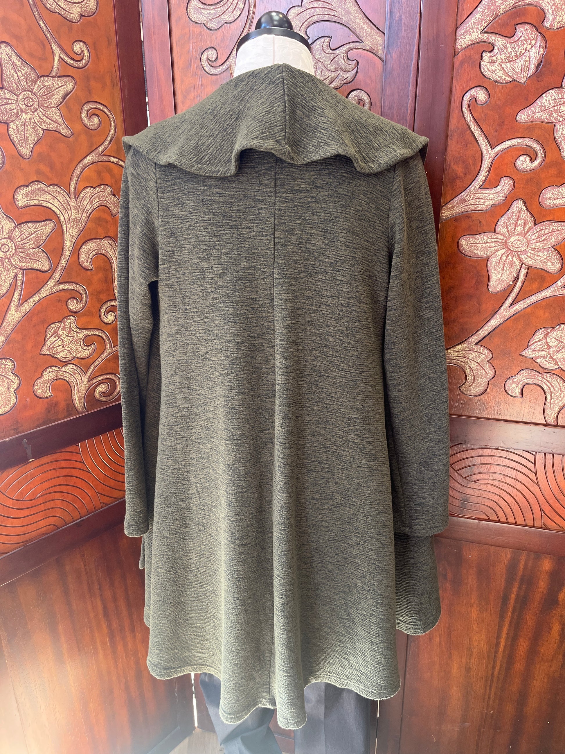 Product features: open front, curved collar creates front lapel, front patch pockets, fitted in shoulders with aline swing over hips, between mid-thigh and knee length on most