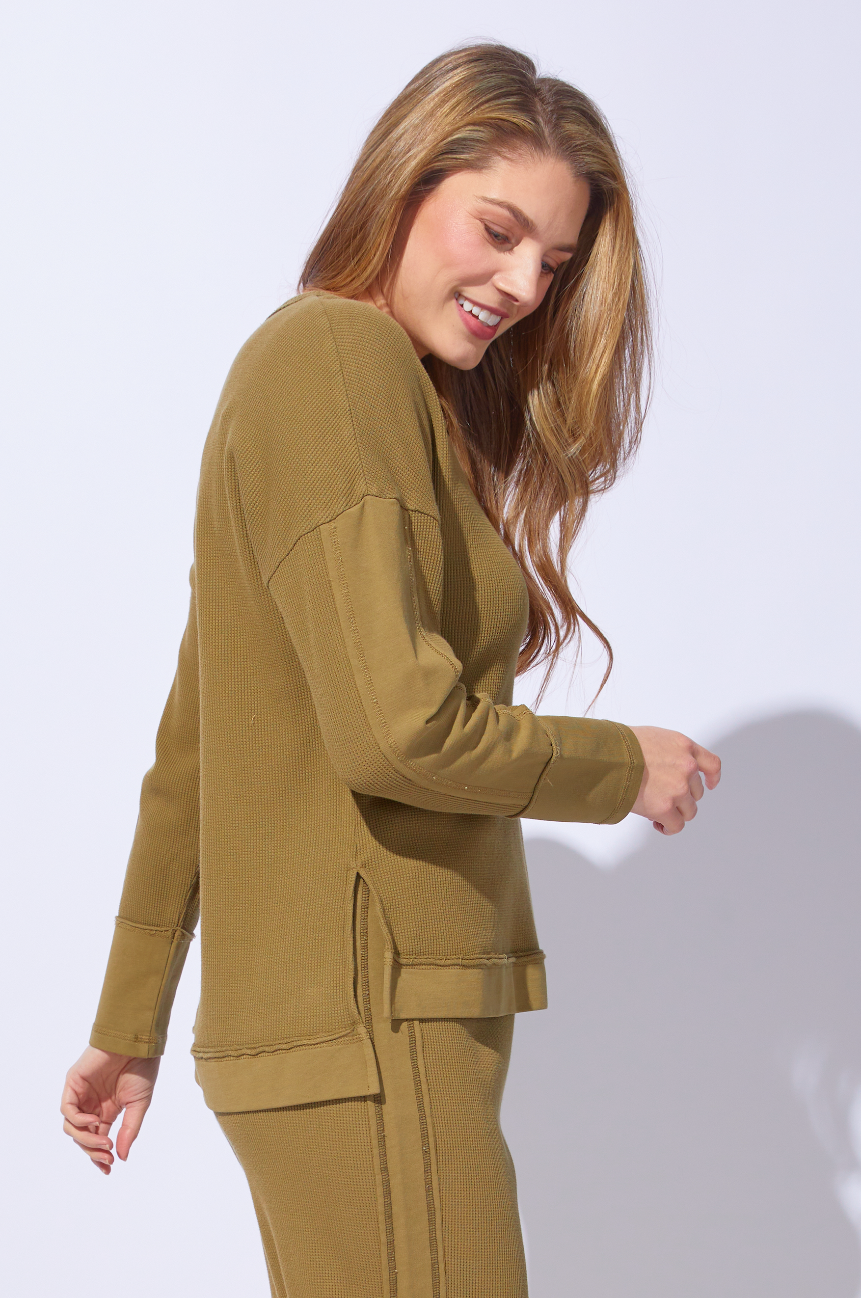 Product details: banded crew neckline, long sleeves with drop shoulders and contrast fabric patch, wide contrast fabric cuff, loose banded bottom hem is longer in back than front, slit at side seams, waist (front) to hip (back) length on most