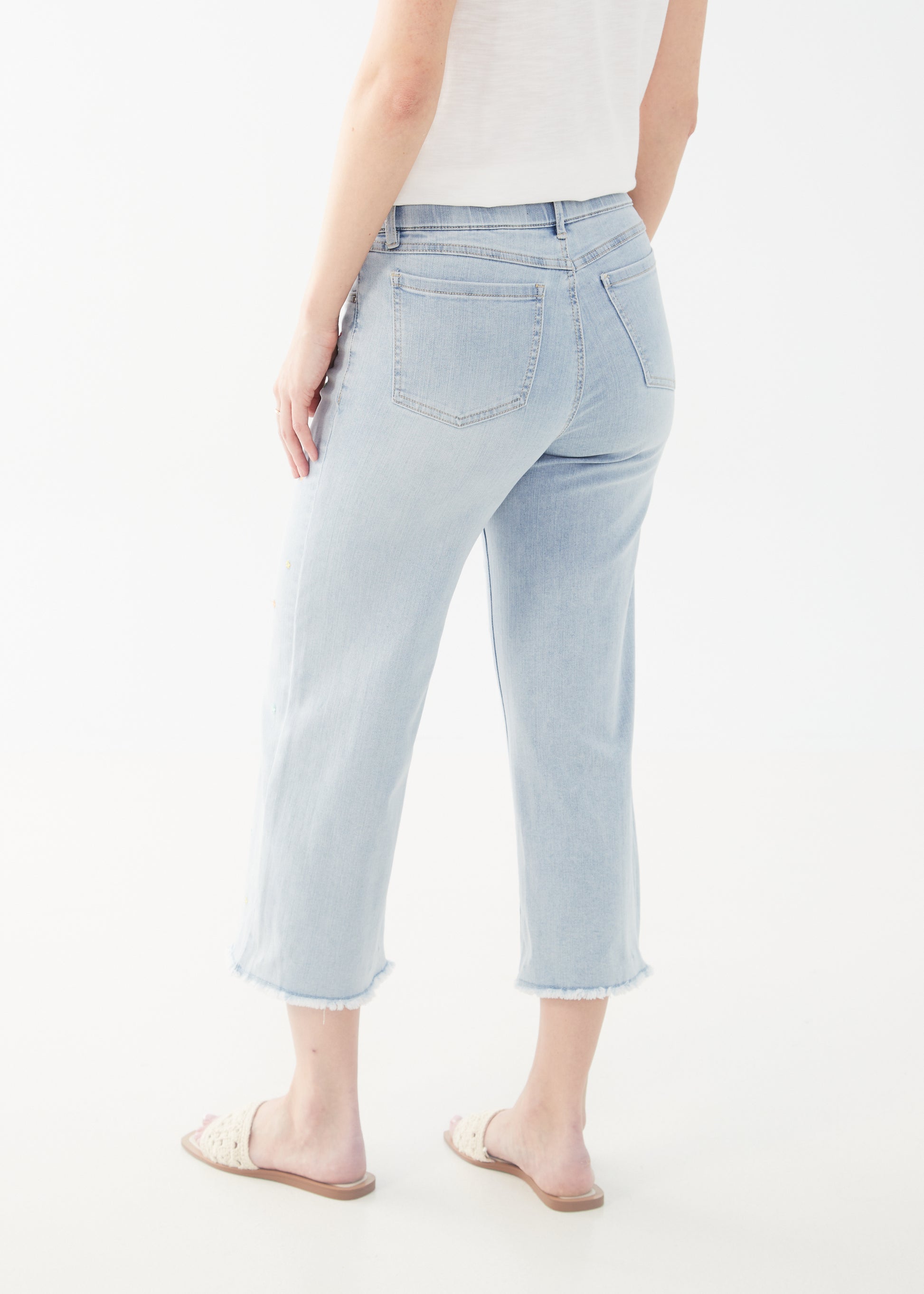 Product details: Smooth pull-on waist band, classic 5-style pockets, belt loops, embroidery on front of legs only, wide cropped leg with frayed edge.