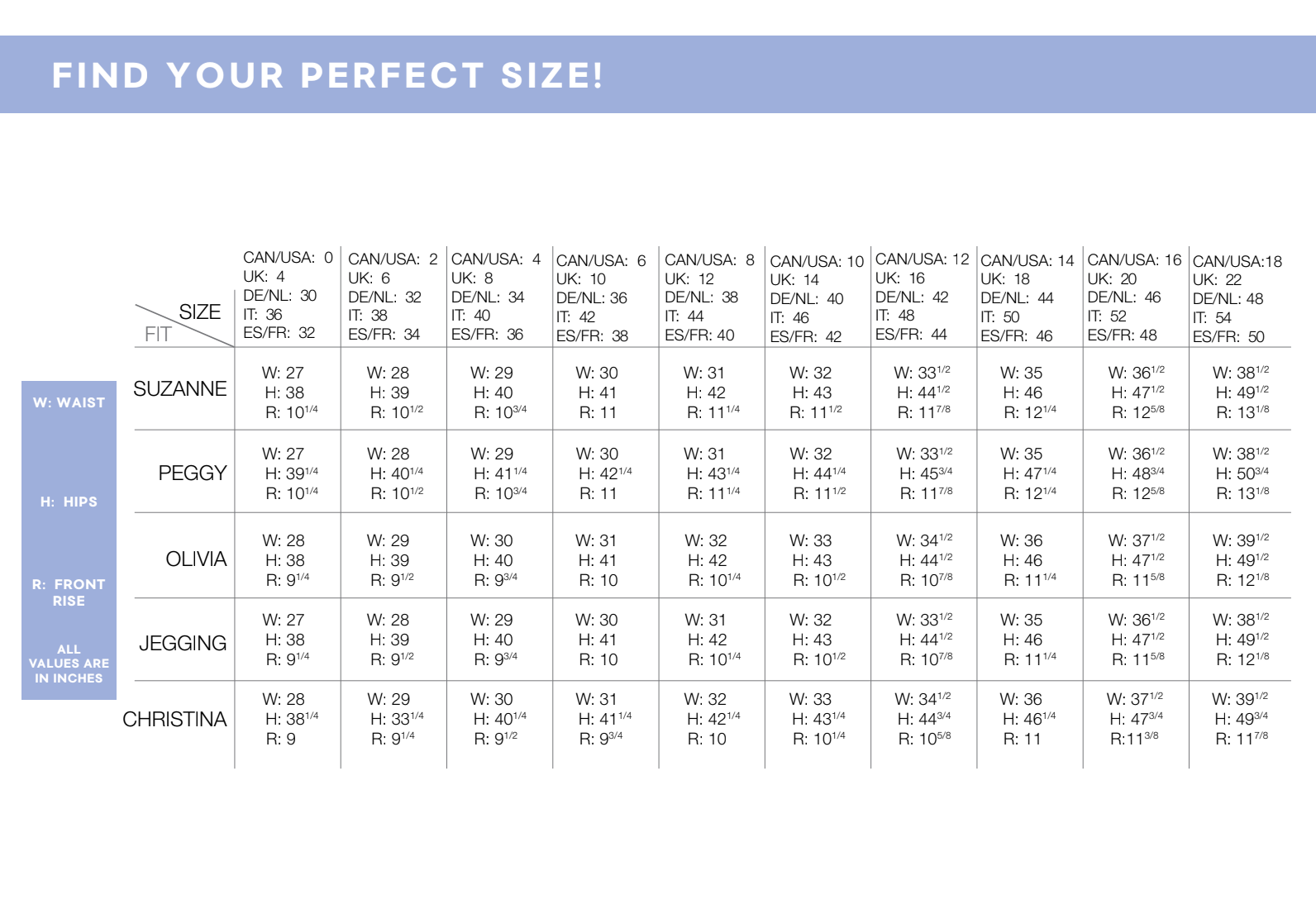 Sizing: 24" inseam. See the fit guide in photos (the pull-on is similar in fit to Olivia) for waist, hip, and rise measurements to determine your perfect fit.