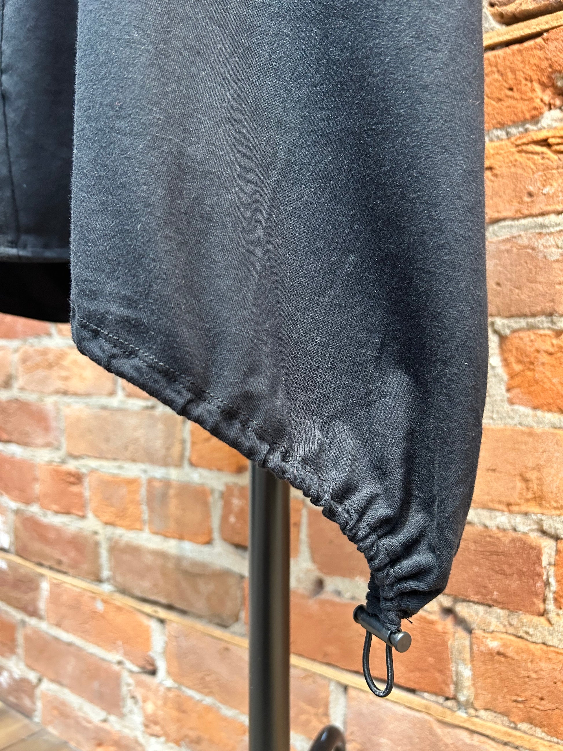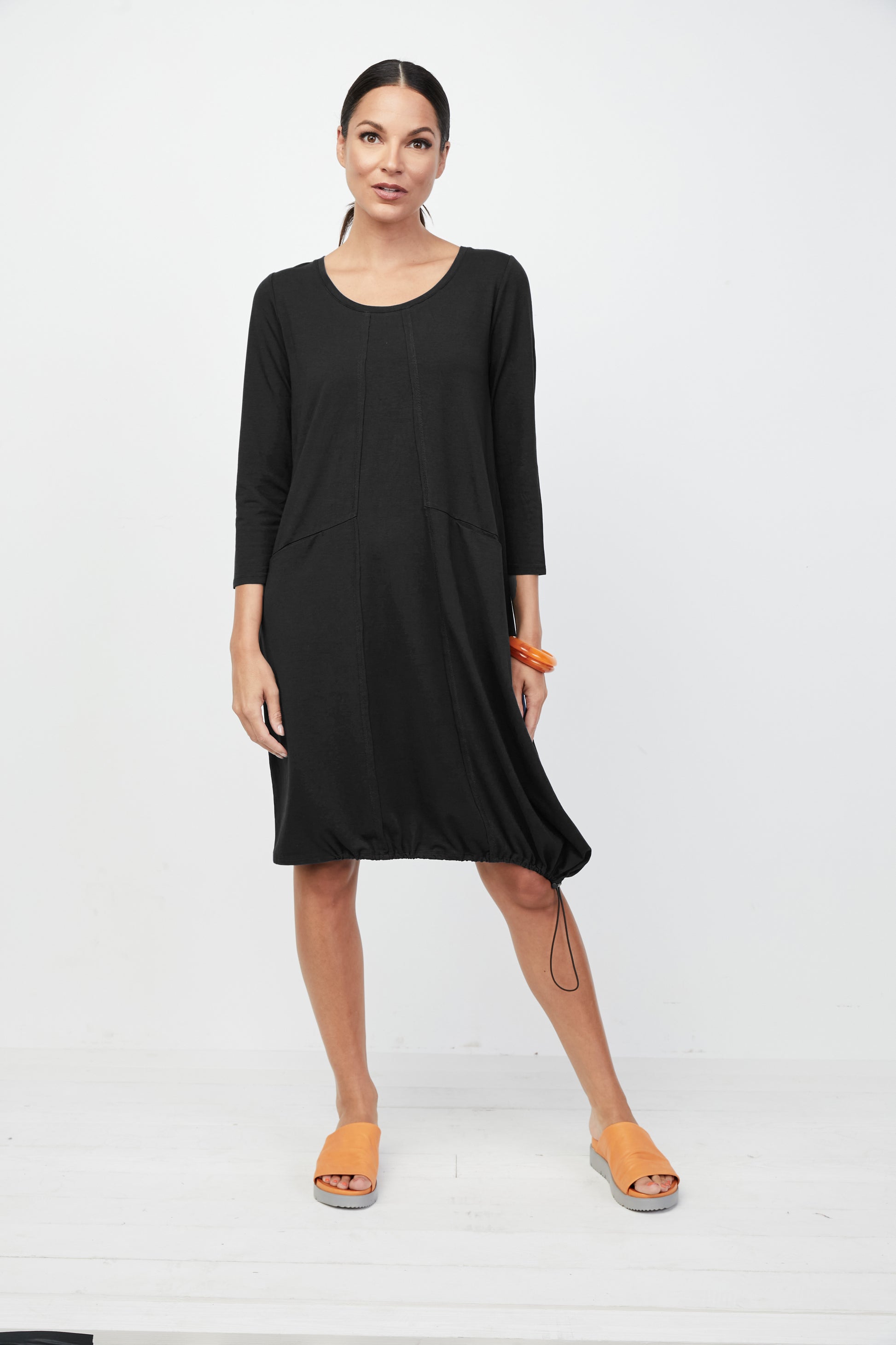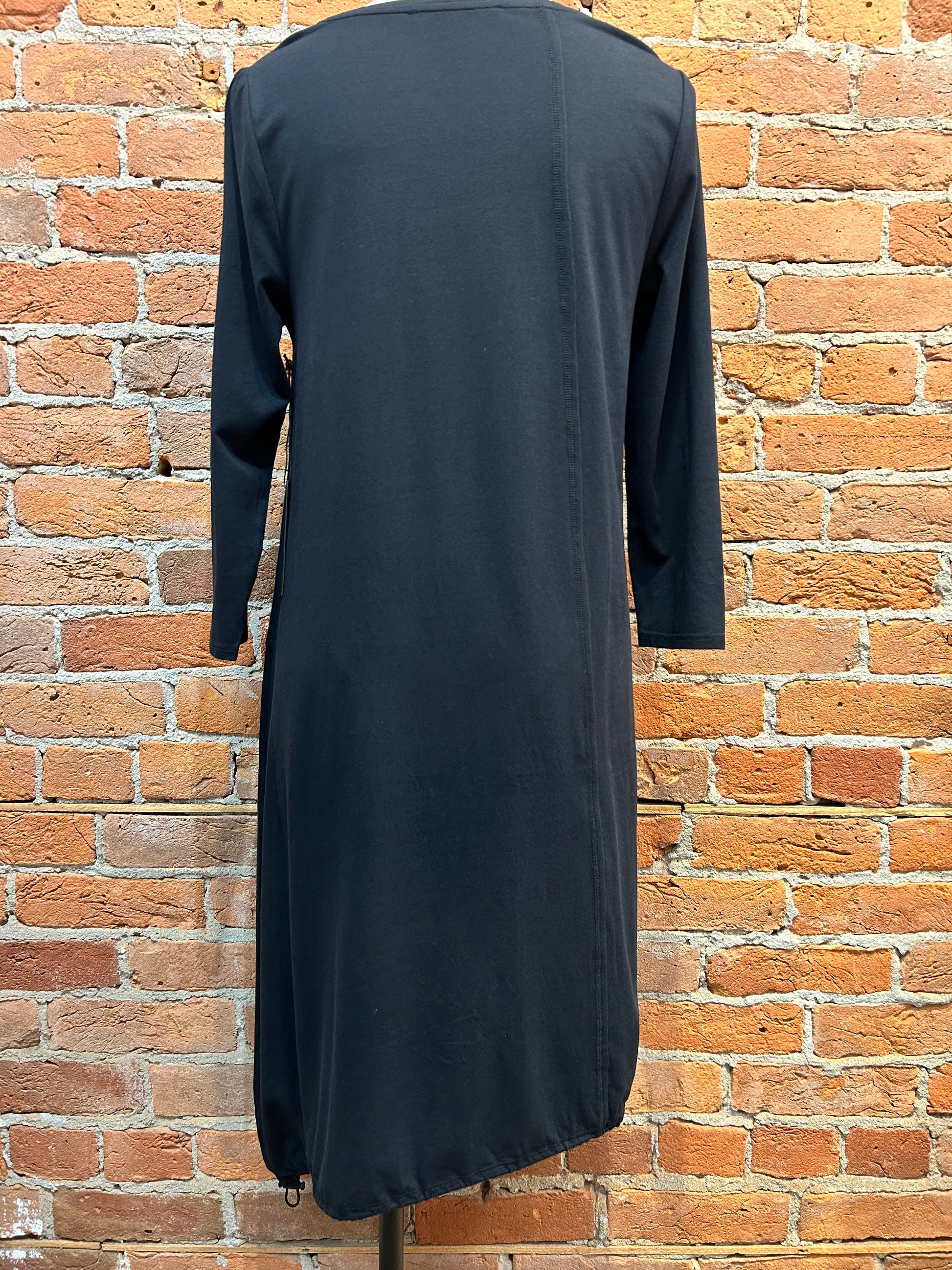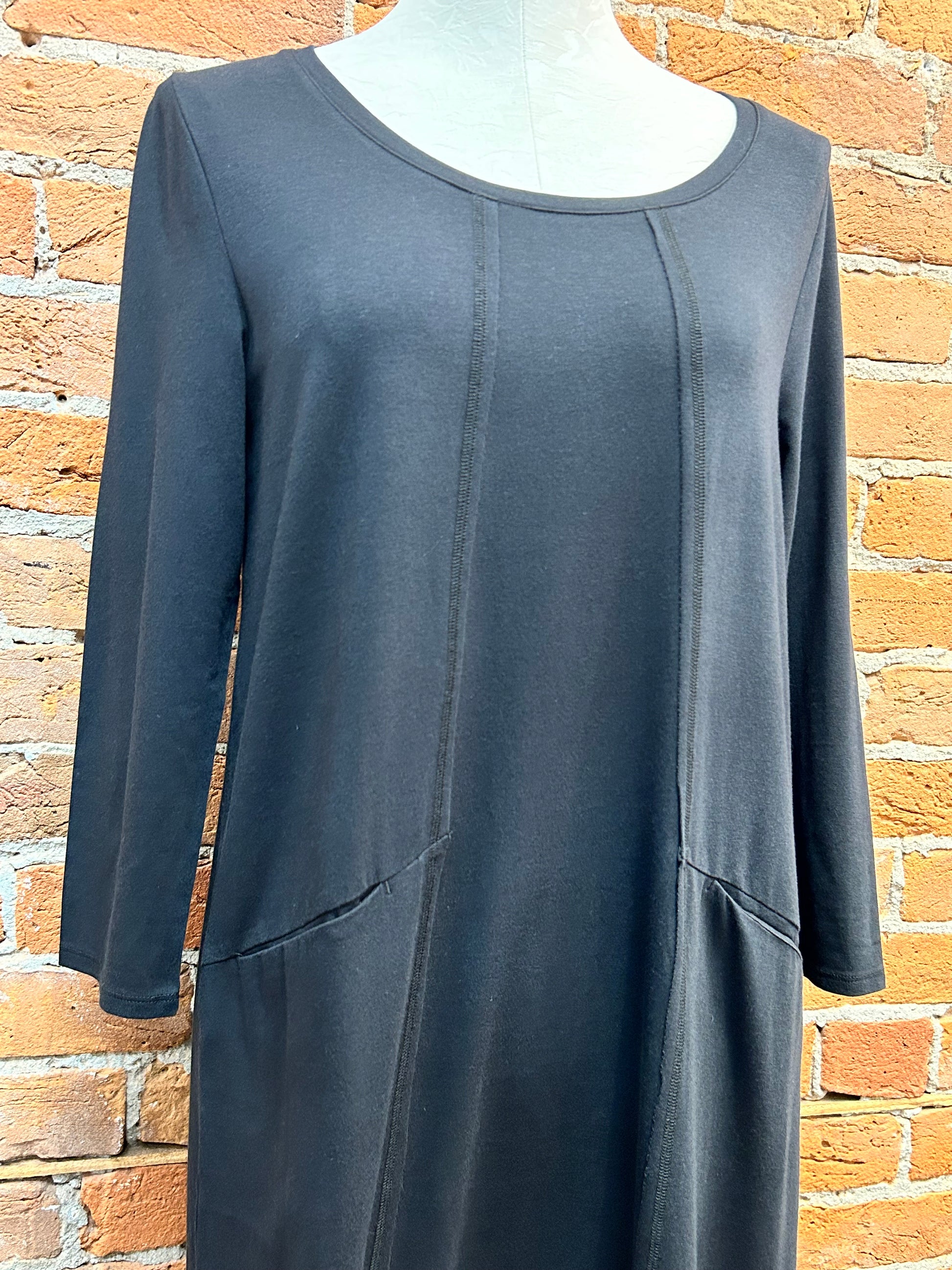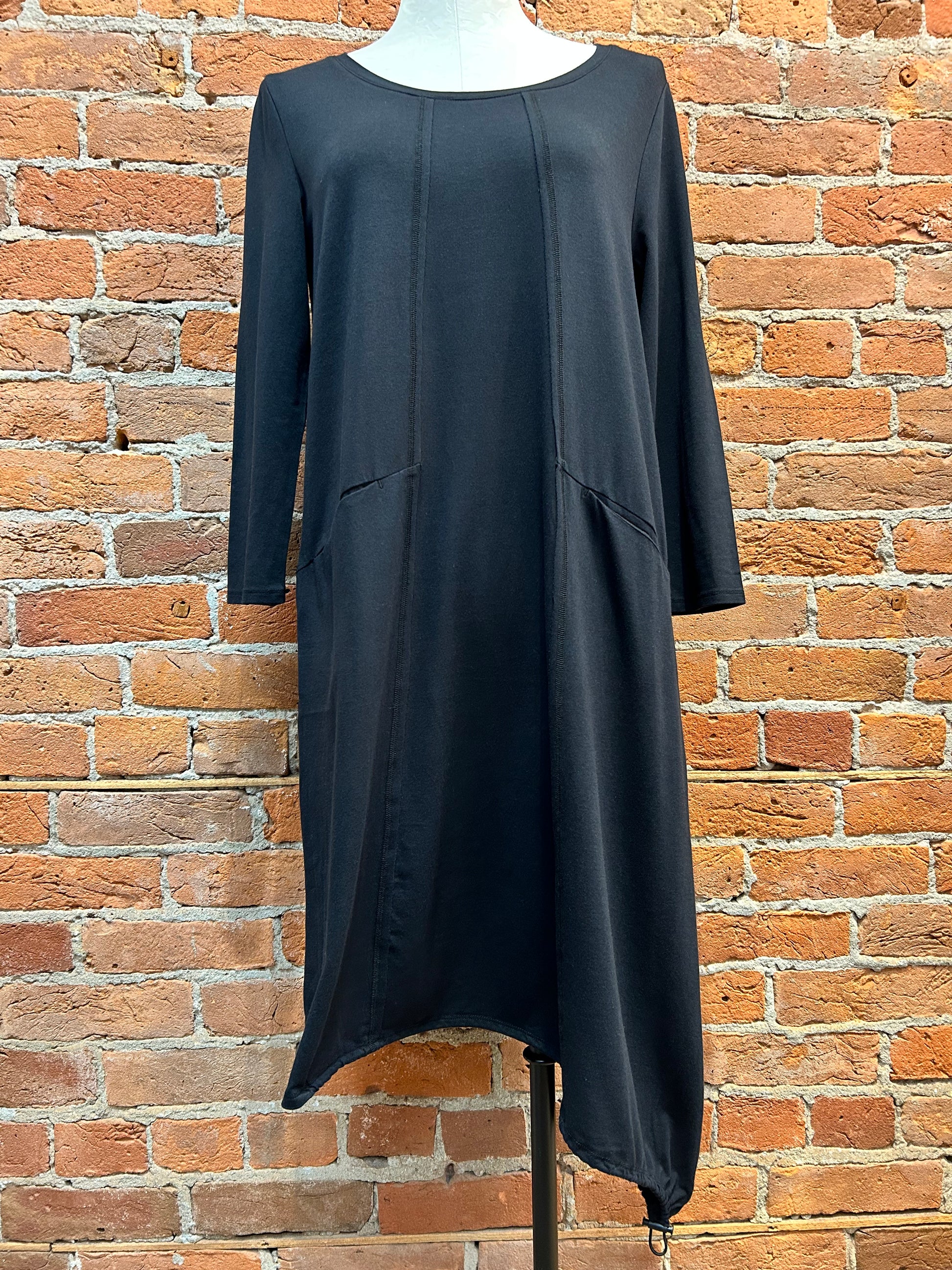 Product details: 3/4 sleeves, round neck, aline shape with drawstring hem, inset panel on front with vertical and diagonal seams add detail, knee length on most