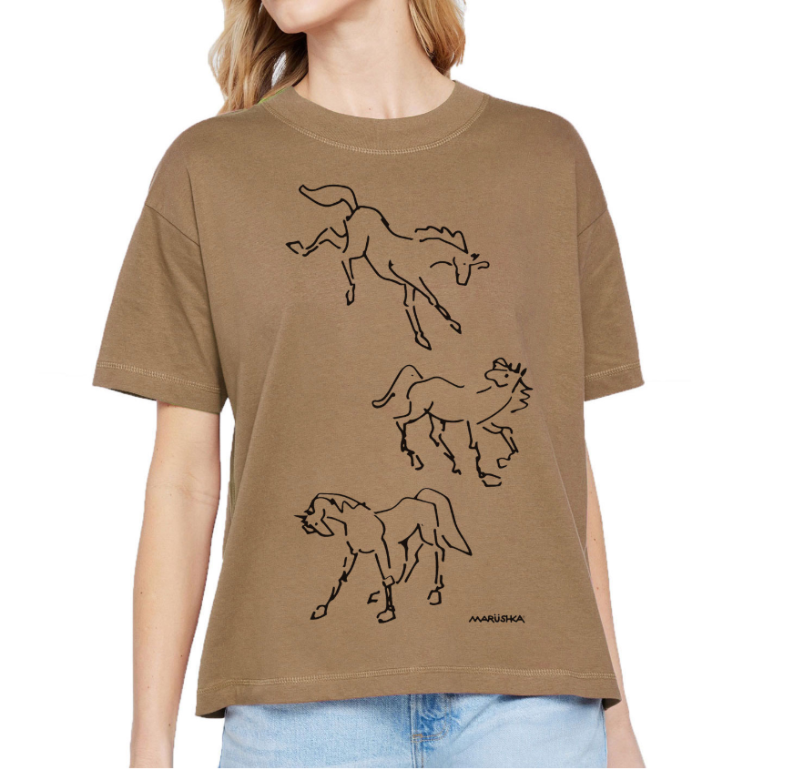 As seen by their fun novelty print t-shirts, Marushka’s mission statement is “To handprint clothing with a sense of humor!” Each garment is printed by hand in the US, using a squeegee to press an environmentally friendly water based ink through a screen/stencil.