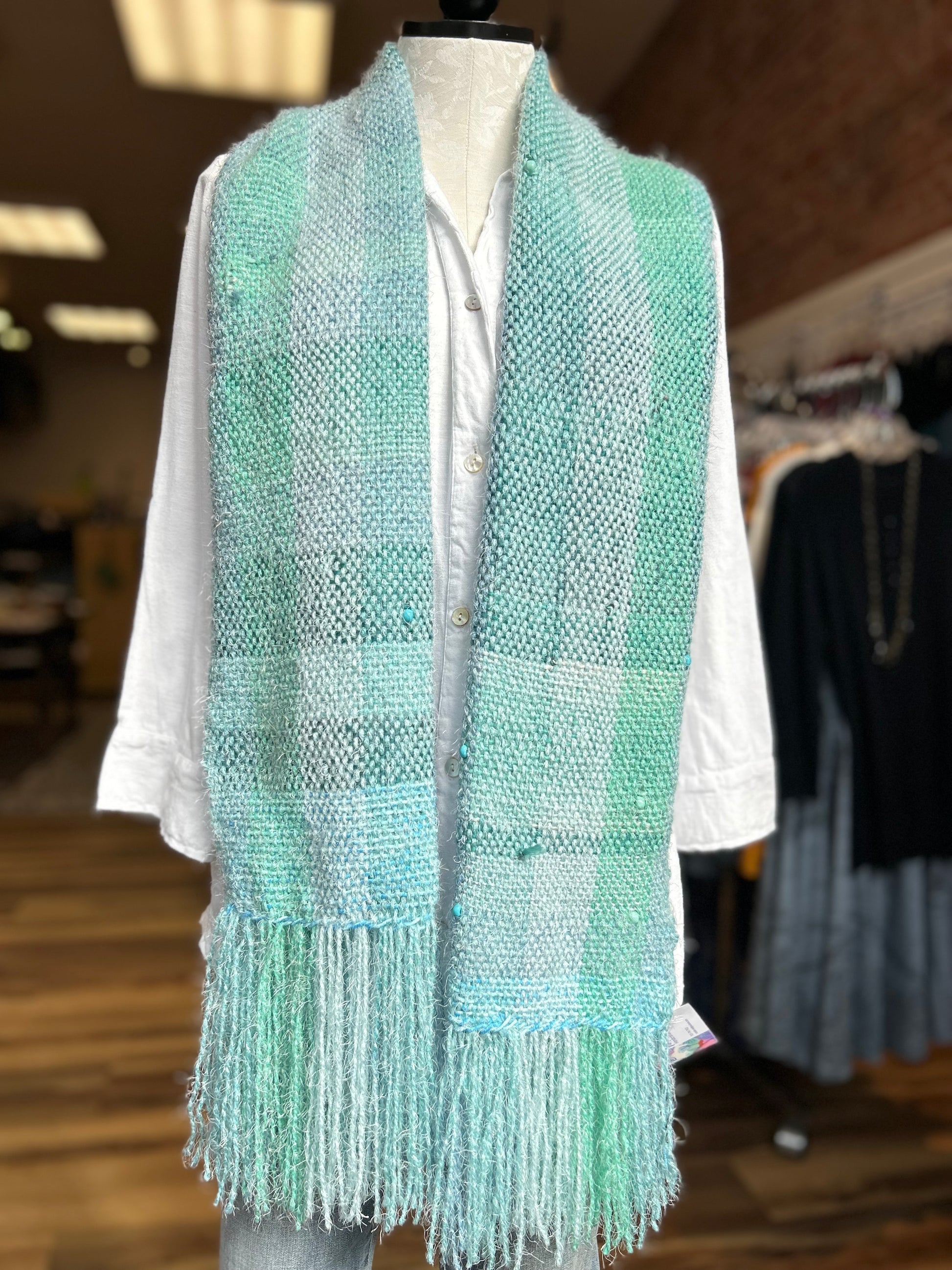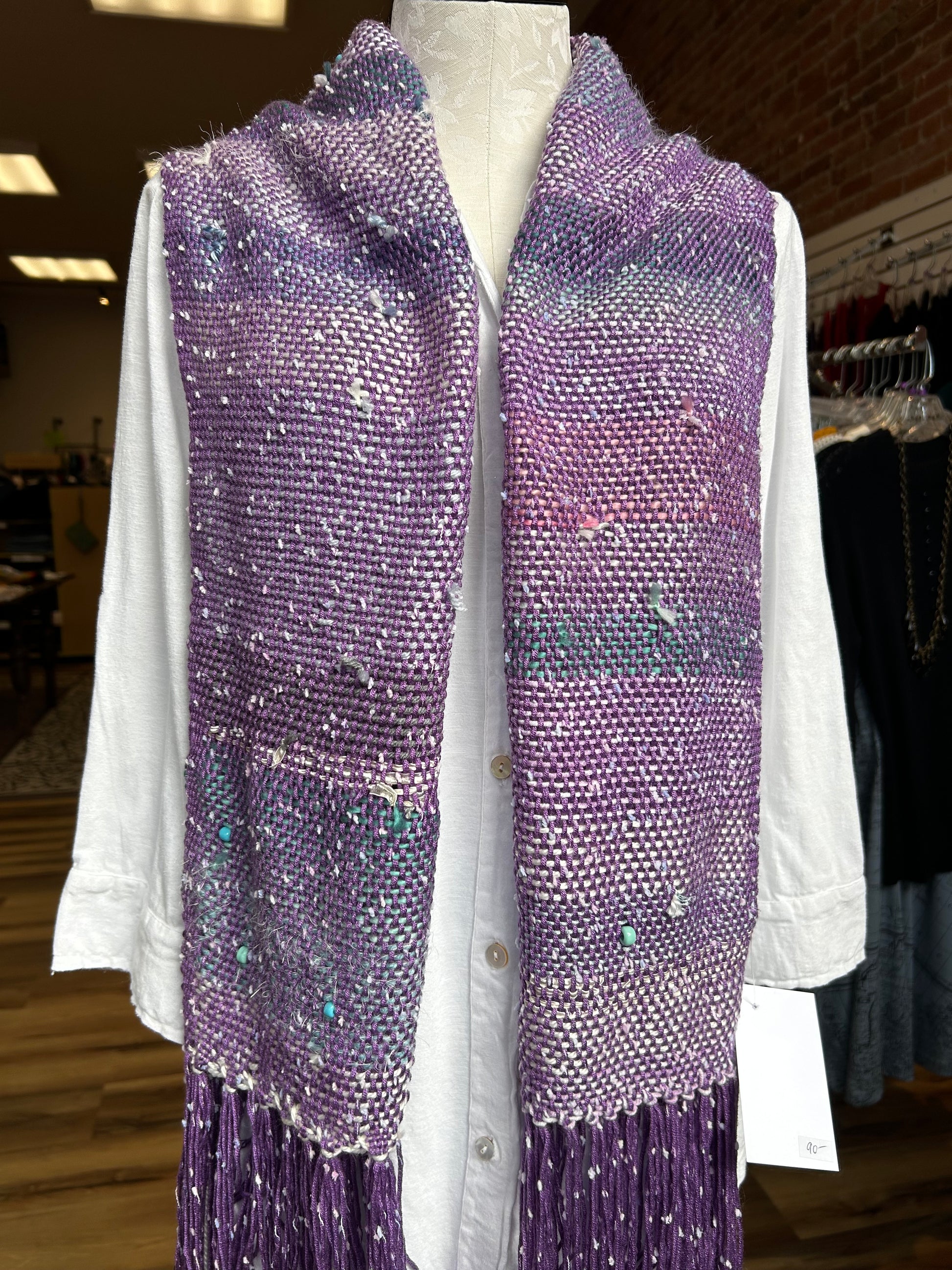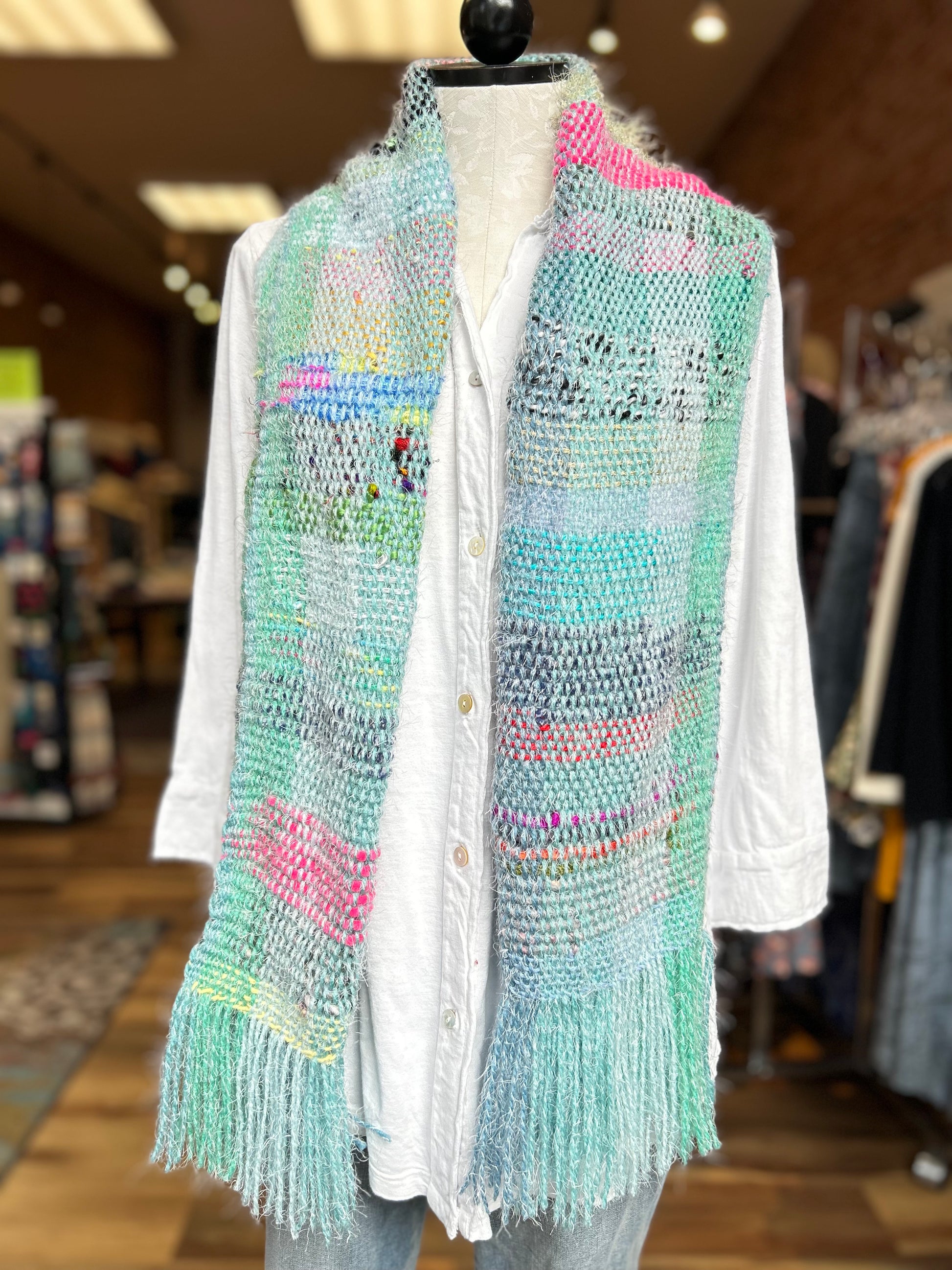 Natalie lives in Eureka, CA--just a few miles away from our Eureka Old Town storefront. She produces these beautiful textiles by hand, weaving free-form instead of using a loom. Each piece is created on the spot, with innovations in color and pattern creatiung one-of-a-kind treasures.