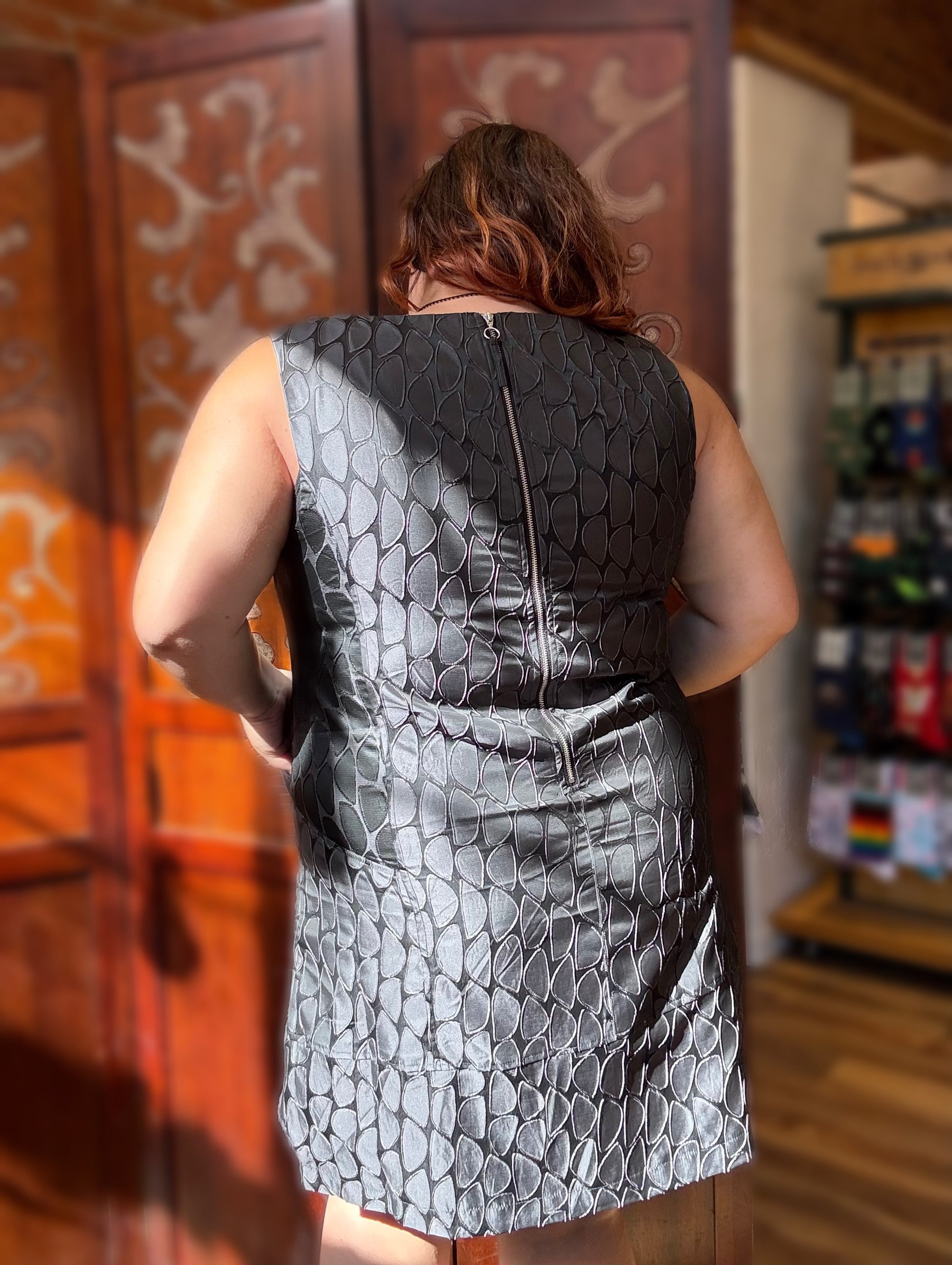 Product details: boatneck, sleeveless, inset pockets on front, back zip, above knee to knee length depending on height